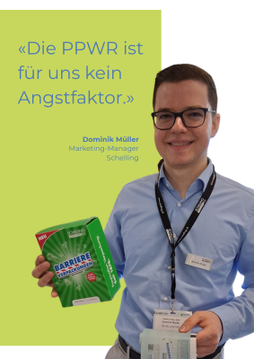 Besonders hebt er die Entwicklung immer dünnerer Folien hervor – und neuer Monomaterialien. Das war auch auf der „Empack“ zu sehen, Schelling etwa stellte eine neue Verpackung aus 100 Prozent Papier mit einer Barriere aus wasserbasiertem Lack vor. Sie ist Teil der Initiative „Substitutes Green“: Schelling hat es sich zum Ziel gesetzt, „bestehende Verpackungen und Einlagen aus Kunststoff durch nachhaltige Alternativen zu ersetzen“. Vor diesem Hintergrund „ist die PPWR für uns kein Angstfaktor“, sagt Marketing-Manager Dominik Müller.